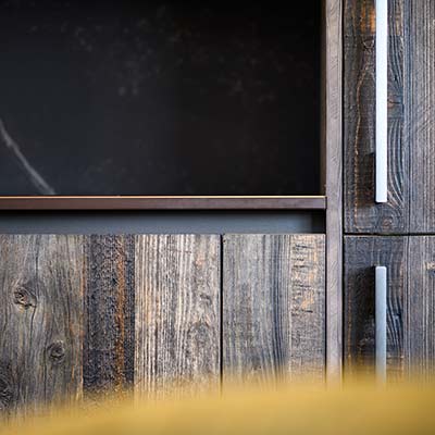 Afin d’amener du caractère à ce linéaire, nos clients ont opté pour une façade en vieux bois de notre partenaire Zecchinon avec un plan de travail Dekton Kelya. Les vitrines permettent d’alléger les meubles hauts au-dessus de l’évier tout en cassant l’effet couloir que peuvent avoir les cuisines linéaires.