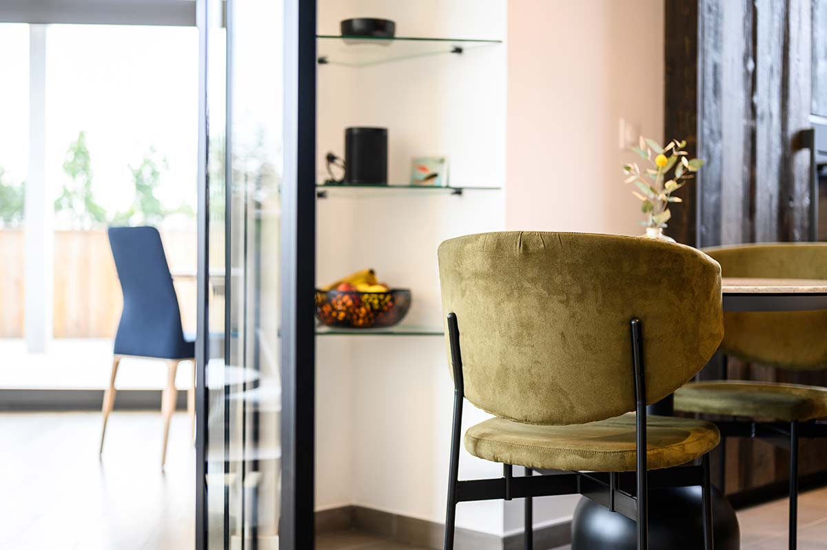 Enfin, nous avons coordonné le travail de notre miroitier et celui des plaquistes de Pitance pour créer une verrière parfaitement adaptée à la forme de la pièce.